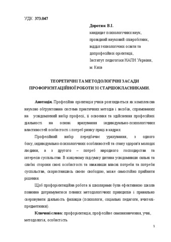 - Доротюк, Валентина Іванівна (2015) Theoretical and methodological foundations of vocational guidance work with high school students Гуманітарний вісник ДВНЗ «Переяслав-Хмельницький державний педагогічний університет імені Григорія Сковороди», 35 (60). pp. 365-368. ISSN 978-966-8840-94-4(7)