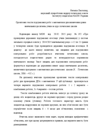 - Листопад, Наталія Петрівна (orcid.org/0000-0002-2922-8450) (2015) The variants of mathematics final examination to evaluate elementary school pupils Початкова школа, 4 (548). pp. 21-22. ISSN 0131-5358