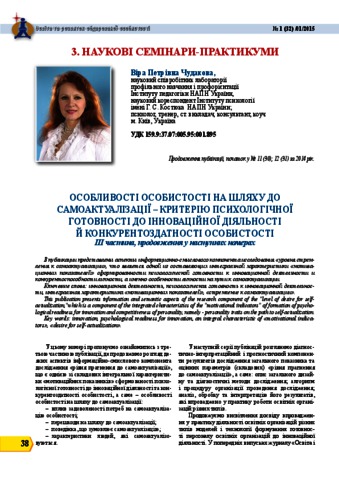 - Чудакова, Віра Петрівна (2015) Features of the individuality towards self-actualization – the criterion of psychological readiness for innovation and the competitiveness of personality Освіта та розвиток обдарованої особистості, 11 (30). pp. 38-50. ISSN 2309-3935