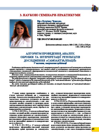 - Чудакова, Віра Петрівна (orcid.org/0000-0003-3801-6545) (2015) The algorithm implementation, analysis, processing and interpretation of the results of "self-actualization" Освіта та розвиток обдарованої особистості, 3 (34). pp. 45-59. ISSN 2309-3935
