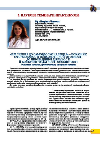 - Чудакова, Віра Петрівна (2015) "Self-improvement" as an indicator of psychological readiness for individual’s innovation activity and competitiveness formation Освіта та розвиток обдарованої особистості, 4 (35). pp. 47-53. ISSN 2309-3935