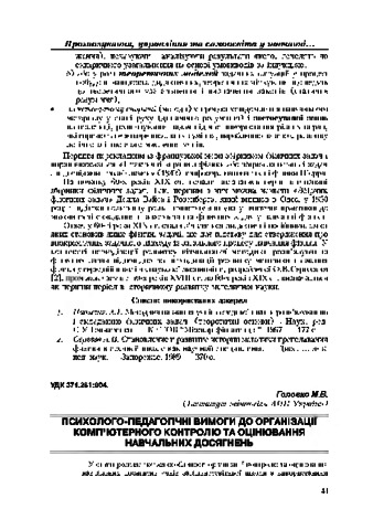- Головко, Микола Васильович (2002) Psychological and pedagogical requirements for the organization of computer monitoring and evaluation of educational achievements Збірник наукових праць Кам’янець-Подільського державного педагогічного університету. Сер.: Педагогічна, 1 (8). pp. 41-49.