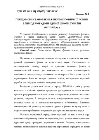 - Головко, Микола Васильович (2013) Conditions of formation of physical school education during the development of unified Ukrainsan school (1917-1920) Педагогічна освіта: теорія і практика, 14. pp. 52-56.