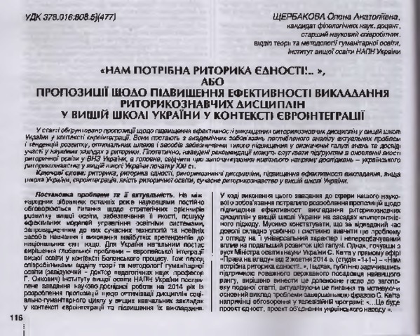 - Щербакова, Олена Анатоліївна (2014) «We need uniting rhetoric!.. », or suggestions for raising the efficiency of teaching rhetoric disciplines at higher school in ukraine in the context of european integration Вища освіта України. - Номер 3(д.1). pp. 116-119. ISSN 2078-1016