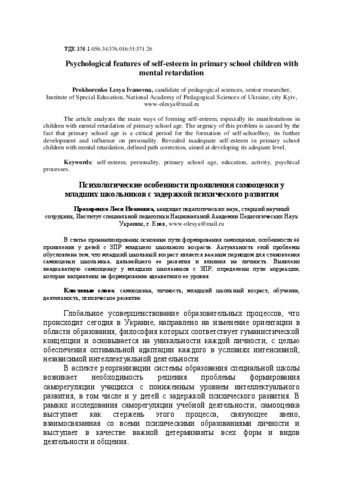 - Прохоренко, Л.І. (orcid.org/0000-0001-5037-0550) (2014) Psychological features of self-esteem in primary school children with mental retardation Научно-исследовательские публикации. Серия: развитие и реабилитация, 1 (5). pp. 76-86. ISSN 2308-1732