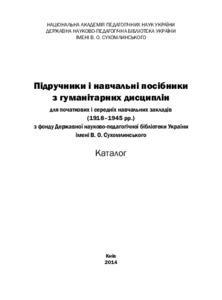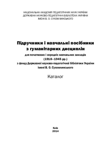 The Catalogue includes those school textbooks and manuals written in Ukrainian, Russian and other languages and published during 1918–1945 which are taken from the library stock of V.O. Sukhomlynskyi State Scientific and Pedagogical Library of Ukraine. The work is done within the research project called “Theoretical principles of formation of integrated specialized information resource under V.O. Sukhomlynskyi SSPL of Ukraine”. The Catalogue is addressed to teachers, scientists, specialists in bibliology, librarians and everyone who are interested in history of pedagogical science and history of school textbook.