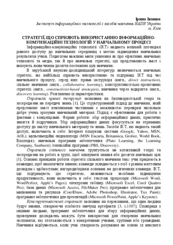 Information and communication technologies provide great potential equal access to learning environments to improve the learning outcomes of students. Educators important to have an idea of how effective educational technologies and media, and so on educational strategies that represent the content and indicate how to reach the goals navchannya.V theses presented the main characteristics of learning strategies that best promote and support the use of ICT in the educational process: direct instruction, collaborative learning, constructivist-oriented strategies, learning through discovery.