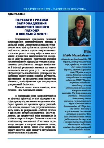 - Бібік, Н.М. (orcid.org/0000-0001-7511-270X) (2015) The benefits and the risks of the competence approach implementation in school education Український педагогічний журнал, 1. pp. 47-58. ISSN 2411-1317