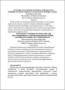- Рождественська, Д.Б. (2006) Work Up Learning Material for Distance Support to Study Ukrainian Language in Senior Classes Extended Proceedings First International Conference “New Informational Technologies in Education for All” . pp. 149-160.