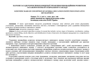 In theses presented algorithm creating of concept that includes various stages of formation, coordination, ranking, quantitative content filling, clarify objectives and identification of aims of innovative development management in a comprehensive educational institution.