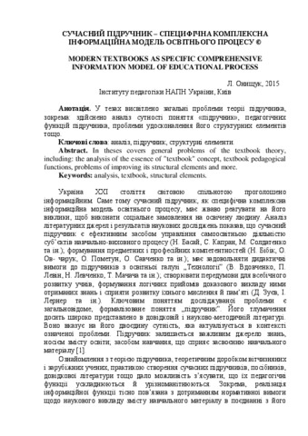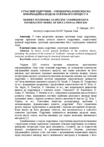 - Онищук, Людмила Анатоліївна (orcid.org/0000-0002-7854-9314) (2015) Мodern textbooks as specific comprehensive information model of educational process In: Міжнародна науково-практична конференція "Управління якістю в освіті та промисловості: досвід, проблеми та перспективи" . Національний університет «Львівська політехніка», м. Львів, Україна, pp. 101-102.