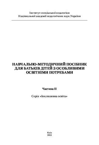 Колупаєва, А.А. (orcid.org/0000-0002-4610-5081), Чеботарьова, О. В. (orcid.org/0000-0002-4560-3708), Сухіна, І.В. (orcid.org/0000-0001-7838-1948), Скрипник, Т. В. and Рібцун, Юлія Валентинівна (orcid.org/0000-0002-2672-3704) (2013) Training manual for parents of children with special educational needs (Part II) . Імекс-ЛТД, м.Кіровоград, Україна. ISBN 978-966-189-243-8
