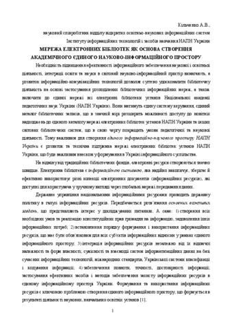 - Кільченко, А.В. (2015) The network of digital libraries as a basis for the establishment of a single scientific and academic information space In: Звітна наукова конференція Інституту інформаційних технологій і засобів навчання НАПН України . Інститут інформаційних технологій і засобів навчання НАПН України, м. Київ, Україна.