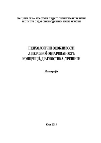 The monograph presents views on the nature of gifted leadership in domestic and foreign psychological theories. It proposes features of gifted leadership study of youth organizations. The method of psychodiagnosis a leadership phenomenon is presented (including the original author methods, published for the first time). Some training techniques of forming leadership skills that can be used successfully in school and student groups are described.