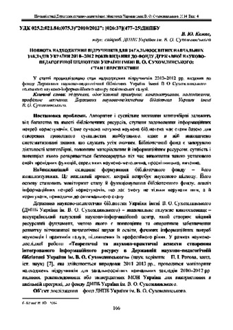 - Кемпе, Вероніка Юріївна (2014) Completeness of Arrivals of Textbooks Published for Ukrainian Secondary Schools during 2010-2012 to the Library Stock of V.O. Sukhomlynskyi State Scientific and Pedagogical Library of Ukraine: State and Prospects Наукові праці Державної науково-педагогічної бібліотеки України імені В. О. Сухомлинського, 4. pp. 166-178.