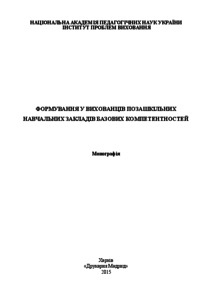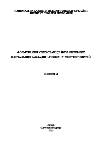 The book presents the results of research of formation of pupils' basic competencies of out-of-school educational establishments conducted by the Laboratory of out-of-school educational establishments of Institute of Problems of Education of NAPS of Ukraine. The authors examine key theoretical principles for implementing the competency approach to out-of-school education. The list of basic competencies that are formed in the cognitive and practical activities of pupils of out-of-school educational establishments by the main direction of out-of- school education. This study is intended for scientific and practitioners of educational system, teaching staff of out-of-school educational establishments, post-graduate students and students.