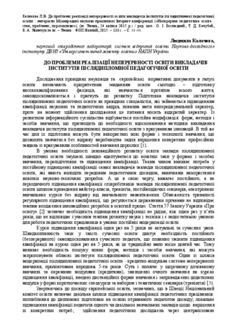 - Калачова, Л.В. (2015) The problem of realization of continuity Teacher Education institutes of postgraduate teacher In: "Неперервна педагогічна освіта : стан, проблеми, перспективи" . ФОП Жовтий, м. Умань, Україна, pp. 41-44.