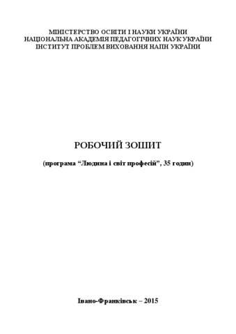 The Workbook of the program "Man and the world of occupations" (35 hours) is a part of program-methodical complex "Man and the world of occupations" for 8-9 grades, which is established by the staff of the laboratory of labor education and vocational guidance of the Institute of Problems on Education of the National Academy of Pedagogical Sciences of Ukraine. It has an aim to help each student to choose a training profile in high school, which meets their interests, needs and possibilities. The publication is made according to the content of the program "Man and the world of occupations" for 9 grades of secondary schools and recommended by Ministry of Education and Science of Ukraine (№14.1 / 12-G-950 from June 23, 2014).