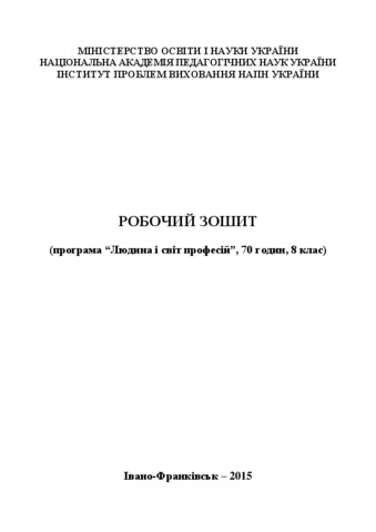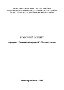 The Workbook of the program "Man and the world of occupations" (70 hours) is a part of program-methodical complex "Man and the world of occupations" for 8-9 grades, which is established by the staff of the laboratory of labor education and vocational guidance of the Institute of Problems on Education of the National Academy of Pedagogical Sciences of Ukraine. It has an aim to help each student to choose a training profile in high school, which meets their interests, needs and possibilities. The publication is made according to the content of the program "Man and the world of occupations" for 8-9 grades of secondary schools and recommended by Ministry of Education and Science of Ukraine (№14.1 / 12-G-950 from June 23, 2014). The workbook is created for this program separately for grade 8 (Part 1) and separately for grade 9 (part 2).