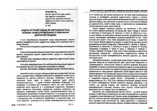 - Огієнко, О.І. (2010) Andragogic approach as a methodological basis of self-directed adult education Вища освіта України у контексті інтеграції до європейського освітнього простору, 5 (23). pp. 218-225.