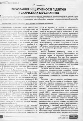 - Чиренко, Наталія Вікторівна (2015) The education of adolescents' initiative in scouting associations Всеукраїнський науково-практичний освітньо-популярний журнал "Імідж сучасного педагога", 5 (154). pp. 62-64.