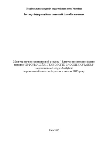 - Шиненко, М.А., Сороко, Н.В. and Ткаченко, В.А. (2015) Monitoring the use of website "Electronic scientific specialized edition of" Information Technology and Learning Tool "using Google Analytics: comparative analysis in March - April 2015 [Experiment]